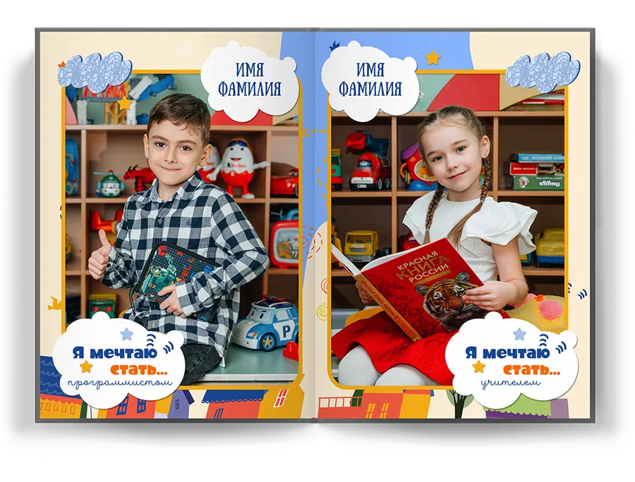 Мы также включили в альбом индивидуальные страницы для каждого ребенка, где он может о том кем мечтает стать, своих достижениях и поставить свою фотографию