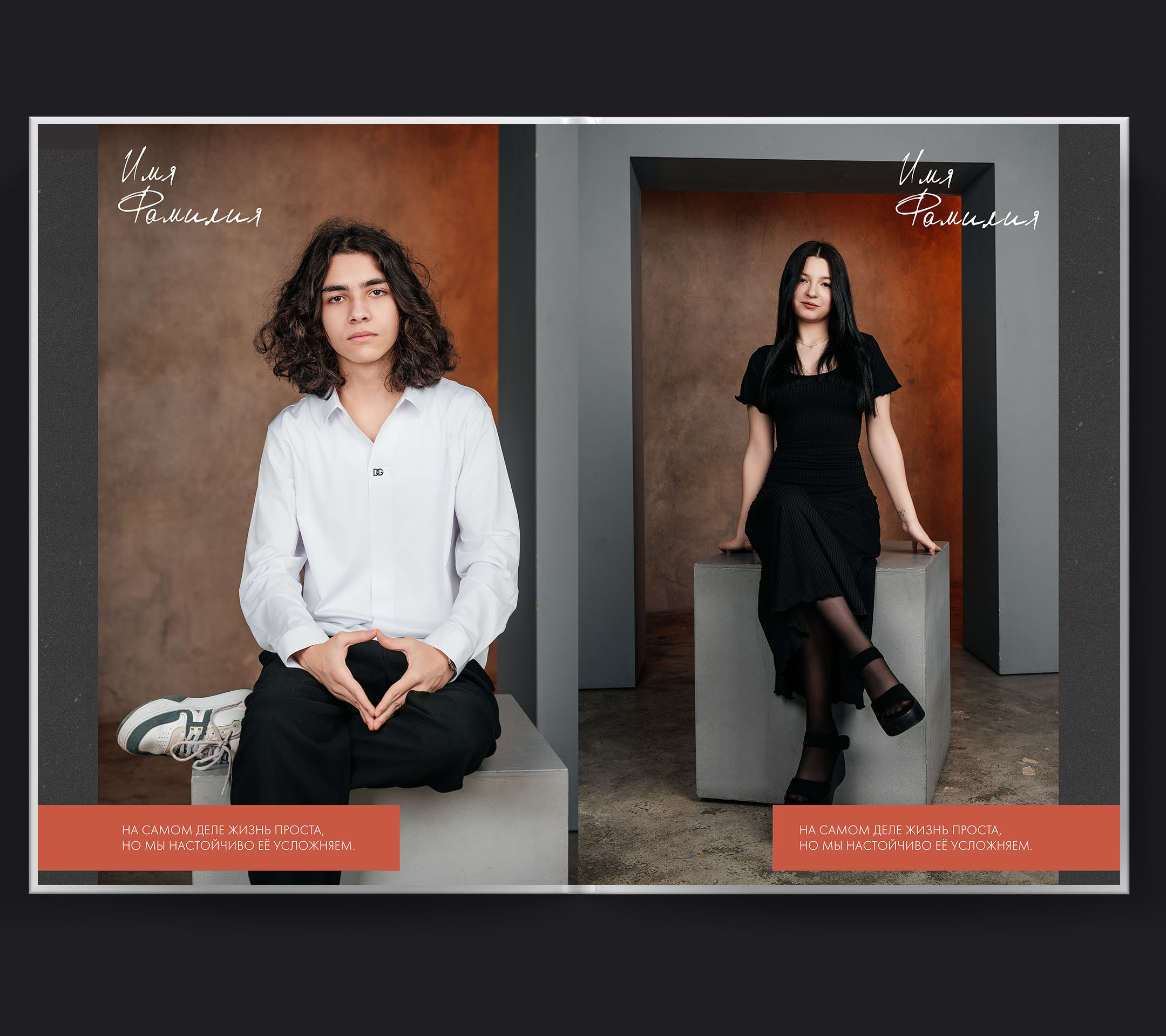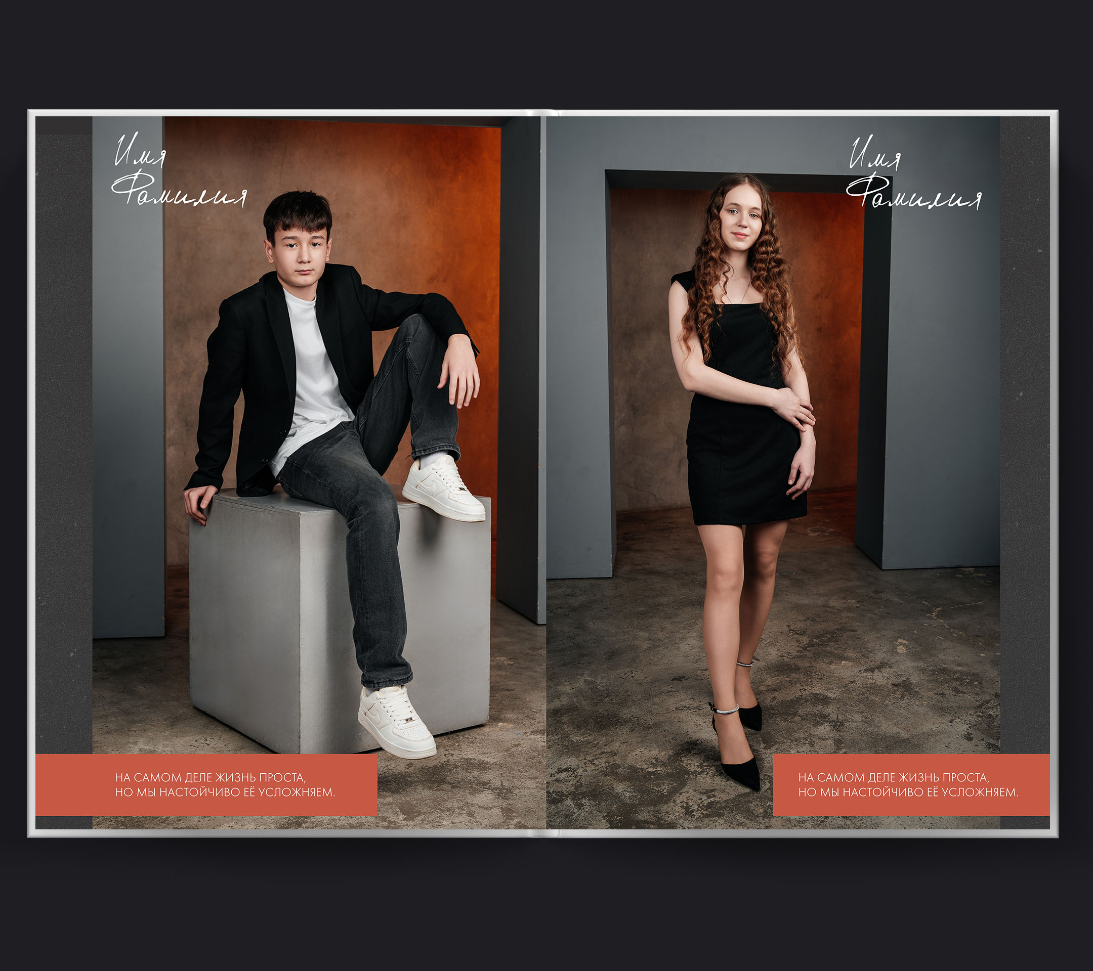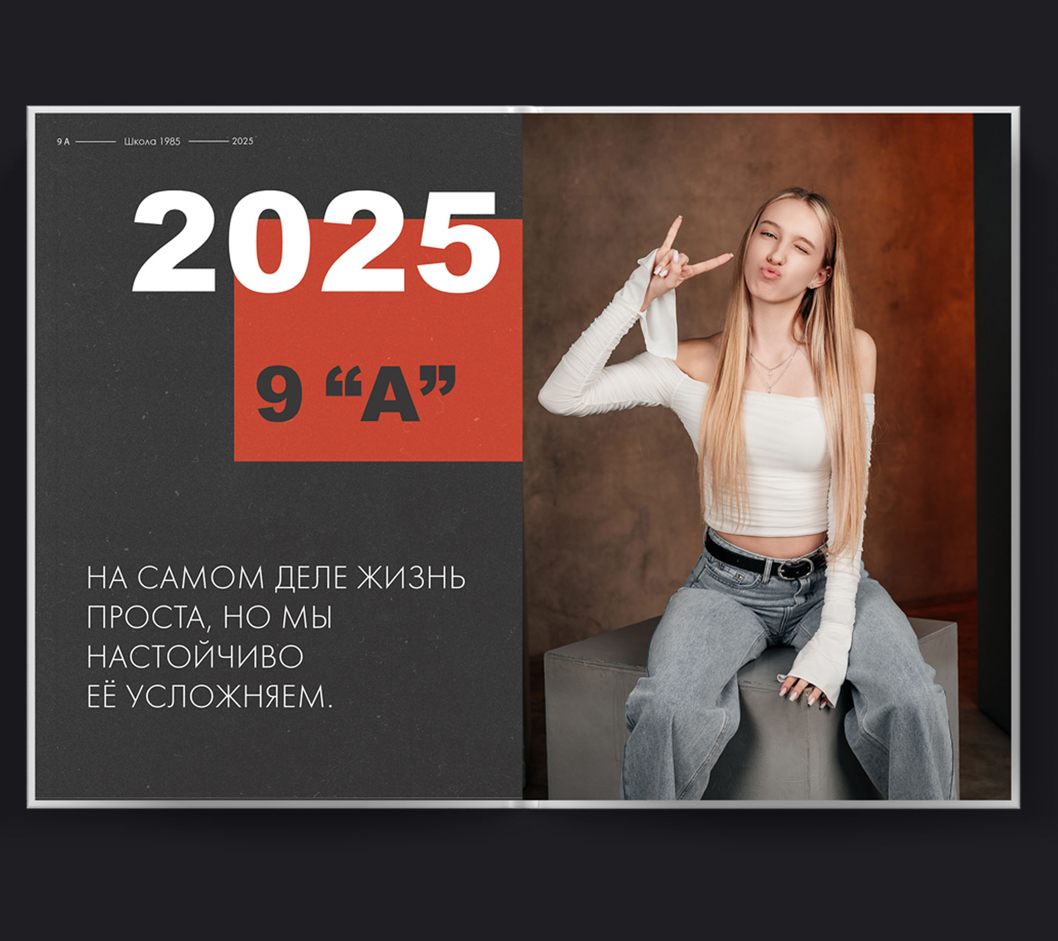 Стильная история вашего класса, воплощённая в минималистичном формате. Основная фотосессия проходит в светлой современной студии: лаконичные фоны, продуманный свет, акцент на индивидуальность каждого выпускника. На снимках — групповые фотографии, где одноклассники позируют в лучших "модельных" позах: расслабленно и уверенно, словно герои модной съёмки, но сохраняется живая атмосфера единства. Часть альбома — это динамичные фото в школьных коридорах и аудиториях, где чувствуется дух родных стен. Чистый стиль и зернистый эффект делают снимки атмосферными, добавляя лёгкий налёт гранжа — современного городского шика и свободы самовыражения. "Grunge" — это воспоминание о выпускном году, где каждый выглядит стильно, а группы — по-настоящему командой. Минимализм и внимание к деталям превращают альбом в модный арт-объект: здесь нет лишнего, только вы и история вашего класса.